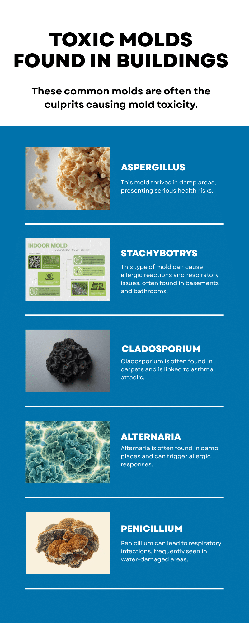 Unlike simple mold allergies, mold toxicity occurs when occupants are exposed to mycotoxins—toxic compounds from molds like Stachybotrys chartarum (black mold), Aspergillus, and Penicillium. These toxins can cause serious health problems that affect productivity, increase absenteeism, and create significant liability risks for building owners.